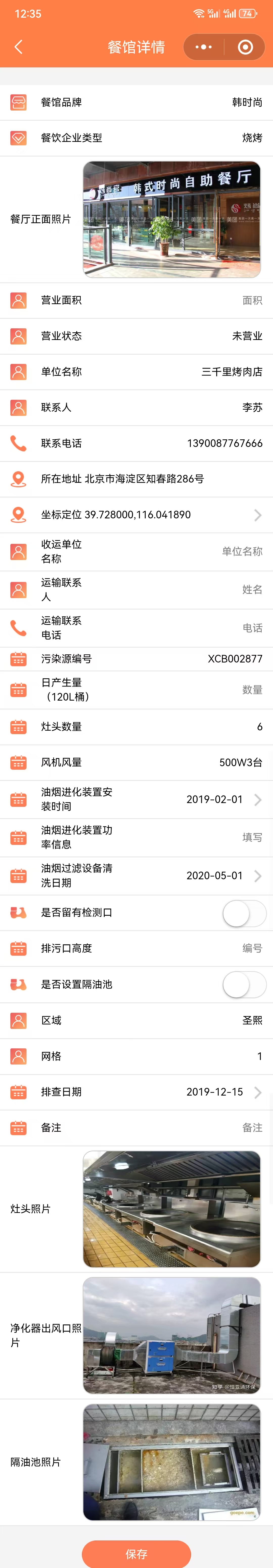 3. 全面信息采集:在巡查過程中,小程序明確規(guī)定了詳細(xì)的信息采集內(nèi)容。一方面,巡查人員需拍攝門頭照片,用于直觀記錄餐飲單位的標(biāo)識;拍攝凈化設(shè)備照片,以便檢查設(shè)備的運(yùn)行狀態(tài)和維護(hù)情況;拍攝蓄油池照片,查看是否存在油污泄漏等問題。另一方面,還要錄入單位名稱、垃圾清運(yùn)單位、聯(lián)系人、電話、營業(yè)面積、灶頭數(shù)量等關(guān)鍵信息,為后續(xù)的監(jiān)管和治理工作提供全面的數(shù)據(jù)支持。
