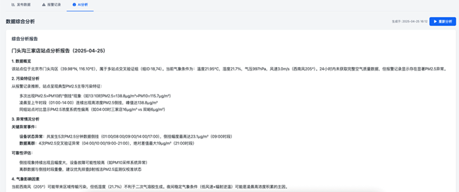 3.     深度報告:自動生成包含AI分析結論的綜合數據報告(如圖7),清晰呈現污染物趨勢、異常事件剖析、氣象關聯性等,為管理復盤和長期規劃提供強有力的數據支撐。
